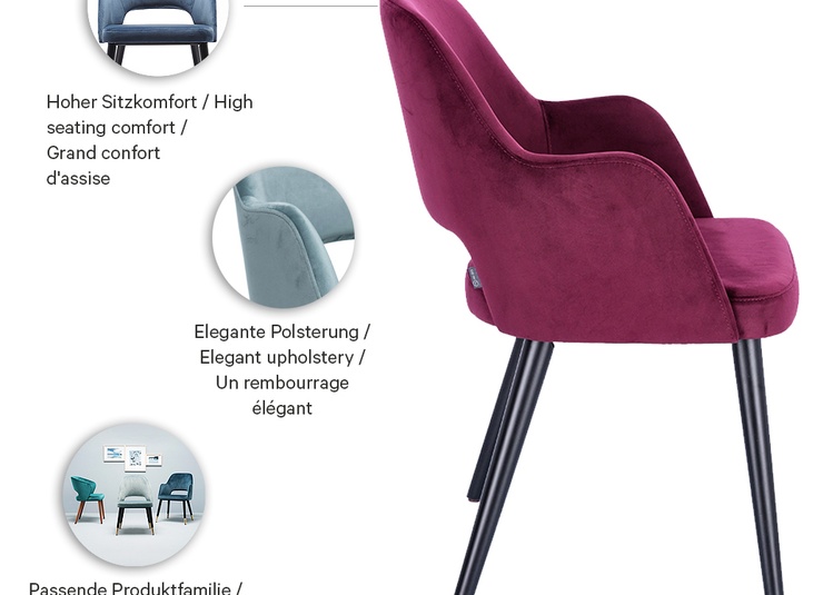 The upholstered chair Liska – optionally with or without armrests – sets a special accent with the distinctive cut-out in the backrest. It impresses with high seating comfort and is available in the upholstery fabrics Cosy, Minea and Cosyshine. Four bases are available: natural oak, Merano brown beech, black powder-coated steel or black with brass sleeves for an extravagant look. In addition, Liska is also available with a swivel base with return function – for more freedom of movement at the table and an automatically tidy look after standing up.- Signature detail: The cut-out in the backrest makes Liska immediately recognizable and sets a clear accent
