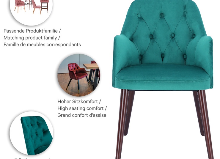 Klassisch und stylish zugleich: Whether as a chair, armchair or bar stool, Marlo impresses with comfort and retro design. The model is optionally available with or without armrests and offers a wide range of upholstery options for different style worlds. Four variants are available for the base frame: natural oak, beech Merano brown, black with brass socks, and powder-coated steel in black. In addition, Marlo is also available with a swivel base with return function – for greater freedom of movement at the table and an automatically tidy look after getting up. This allows flexible combinations for a wide variety of interiors in gastronomy and hospitality. Marlo combines retro charm with modern comfort and individual versatility.- Versatile types: Marlo is available as a chair, armchair or bar stool – suitable for any setting