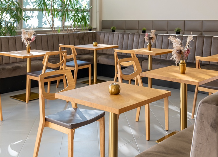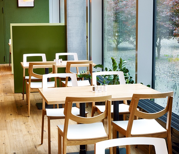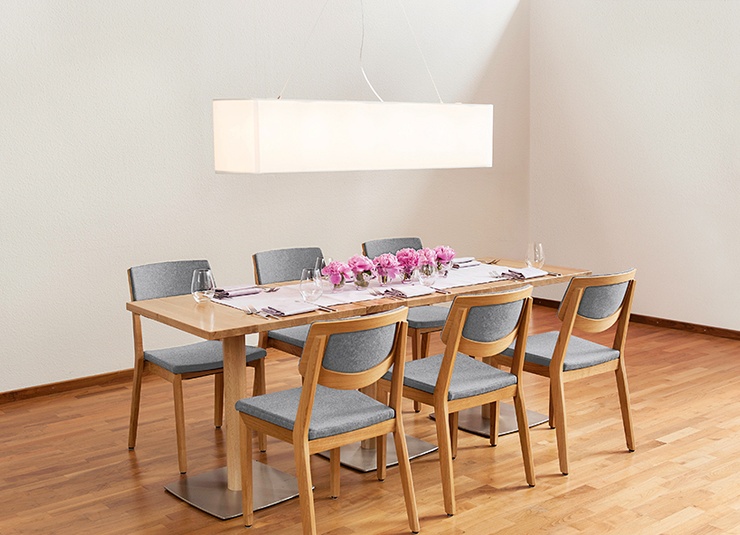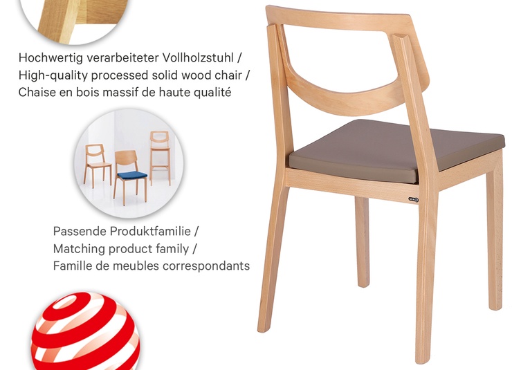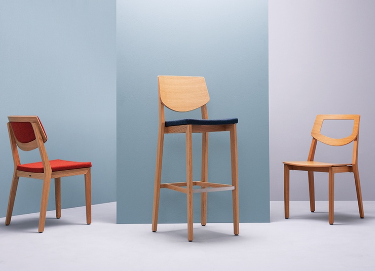 The model Quorum O with an open backrest is available with beech wood or oak wood in different colours, with laminate, wooden or upholstered seat aswell with an upholstered backrest. The chairs are stackable. The bar stool has a footrest made of stainless steel. This chair was designed by GO IN and appeared in 2010. It was awarded the Red Dot Design Award.Product Code