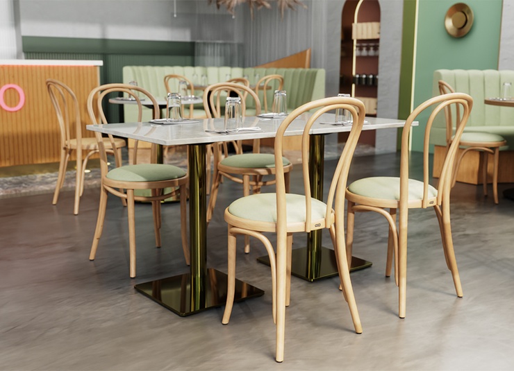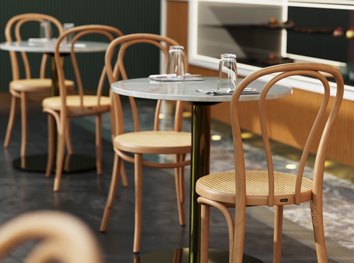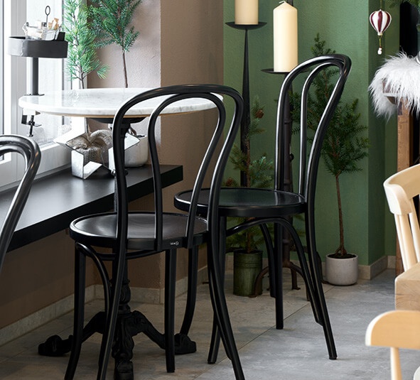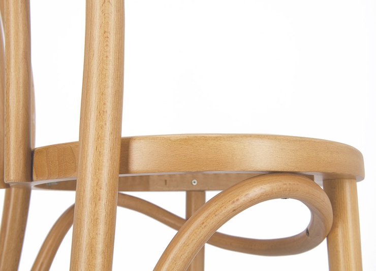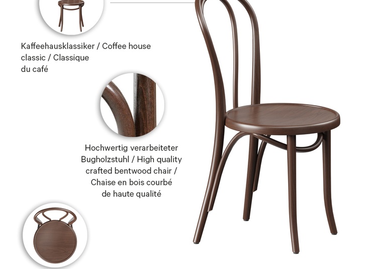 Gion is a classic Viennese coffee house chair made of bentwood. It is available in beech walnut, black beech, or oak-stained and lacquered beech. Bentwood is solid wood that has been bent. The process of bending wood without breaking it was developed around 1830: The master carpenter Michael Thonet succeeded in using steam to bring wood into a stable curved shape. Steam softens the lignin, which is responsible for the strength of wood, allowing the piece of wood to be bent. This process is still called the Thonet method after its inventor. Beechwood, in particular, can be shaped into a beautifully curved form due to its relatively short wood fibers.Product Code