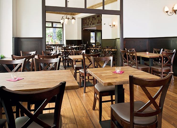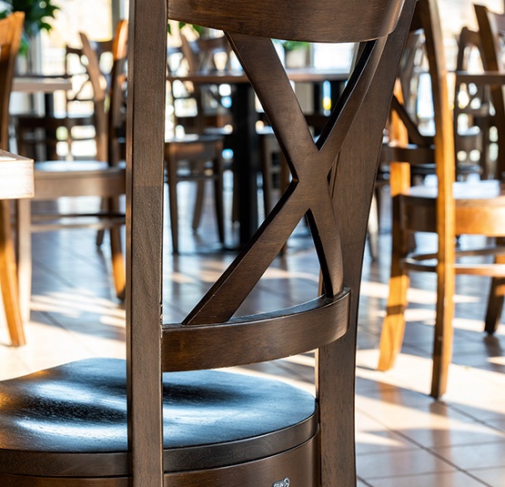 Una is a classic chair for restaurants in trattoria style with it´s characteristic x-back, made of Hevea wood walnut. The seat can be upholstered wit artificial leather Casual in three colours. Optional there is a footrest for the barstool available.Product Code