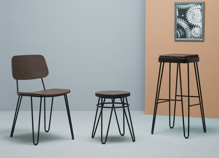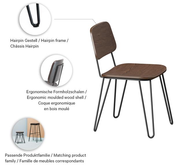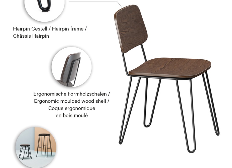 A retro chair par excellence: Yago features a black powder-coated steel frame and walnut-stained ash bentwood (stool, bar-stool: Hevea wood) to create an industrial ambience, perfect for modern loft apartments.