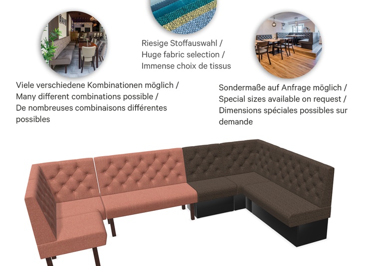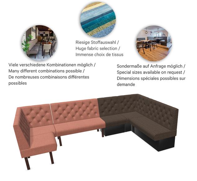The Hester bench system - consisting of a 60 cm element, 120 cm element and inner corner (70 x 70 cm) - is versatile. The elements can be easily linked together. There is a free-standing version and a wall-mounted version with stretch fabric on the back. The frame is available in dining table and high table heights and can be combined with different colored legs and plinth panels. Hester is part of the fabric collection and therefore available in numerous color and fabric variations.Product Code