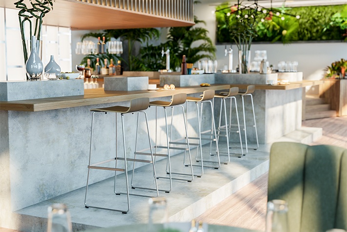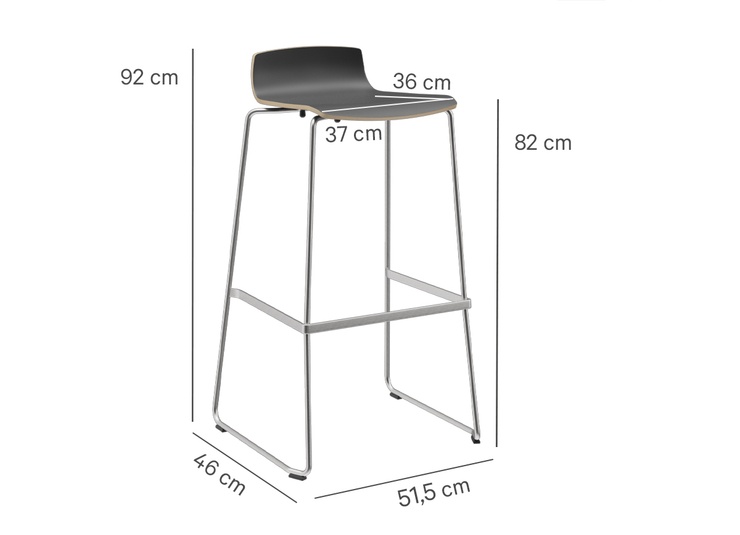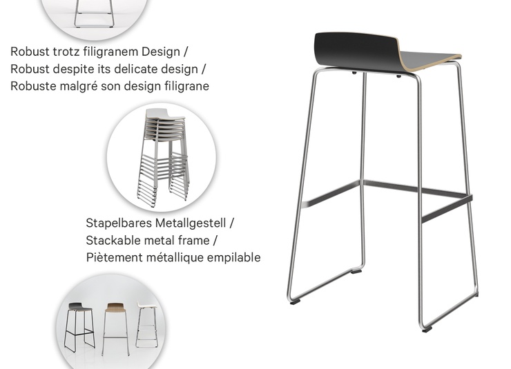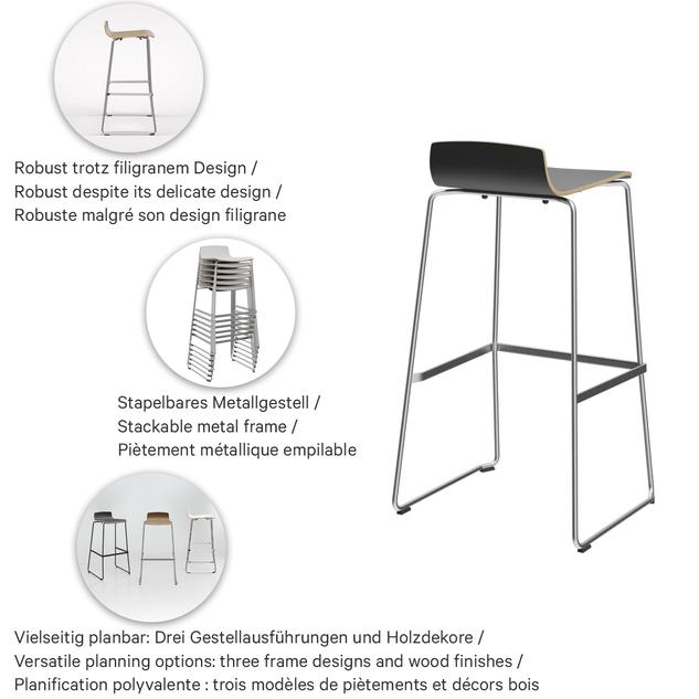 The professional bar stool Yoko in proven GO IN contract quality combines minimalist design with high everyday usability and fits anywhere from seminar areas to wine bars. The seat shell made of laminate-coated molded wood is available in three decors and brings a clear, modern line to different interior concepts. For the metal frame, Yoko offers maximum design freedom with steel powder-coated in black, chrome-plated steel, or matte brushed stainless steel. Despite its delicate look, the bar stool is extremely robust, suitable for contract use, and designed for intensive use in gastronomy and hospitality. Particularly practical in operation: the metal frame is stackable and enables flexible use of space as well as space-saving storage. In addition to the bar stool (92 cm), Yoko is also available as a stool (56 cm) – ideal for a consistent interior concept.- Versatile planning: Three frame versions and three wood decors fit a wide variety of contract concepts