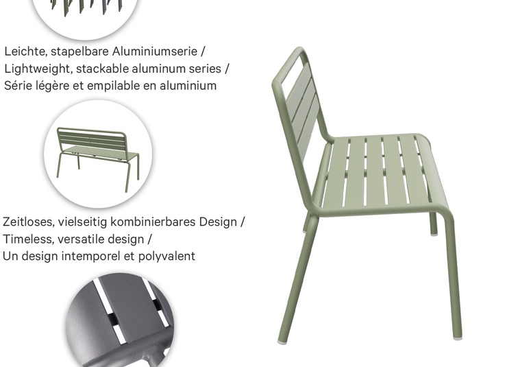 The Heco furniture series made of powder-coated aluminum includes chair, armchair, barstool and 2-seater bench. All elements are lightweight, stackable and suitable for flexible seating in indoor and outdoor areas. The powder-coated surfaces are easy to maintain, scratch-resistant and designed for heavy everyday use. The deliberately slightly larger frame diameter is a key design feature: it emphasizes the round, soft lines and gives the series a calm, high-quality appearance. The timeless look of this specially developed collection blends equally well into cafés, restaurants, bars, hotels, offices and public facilities.- Lightweight, stackable aluminum series for gastronomy and contract use.