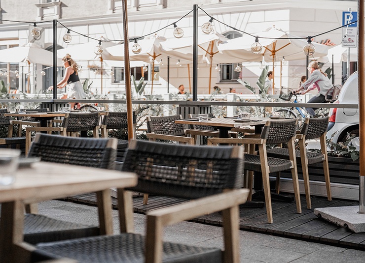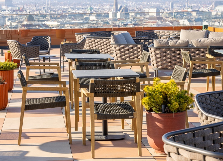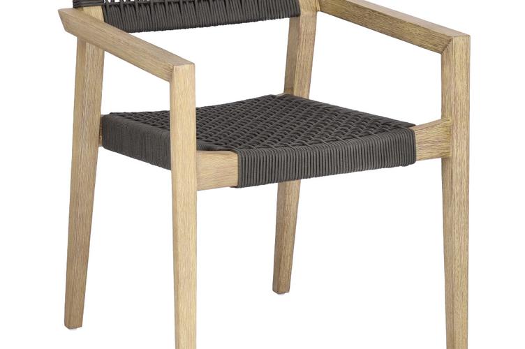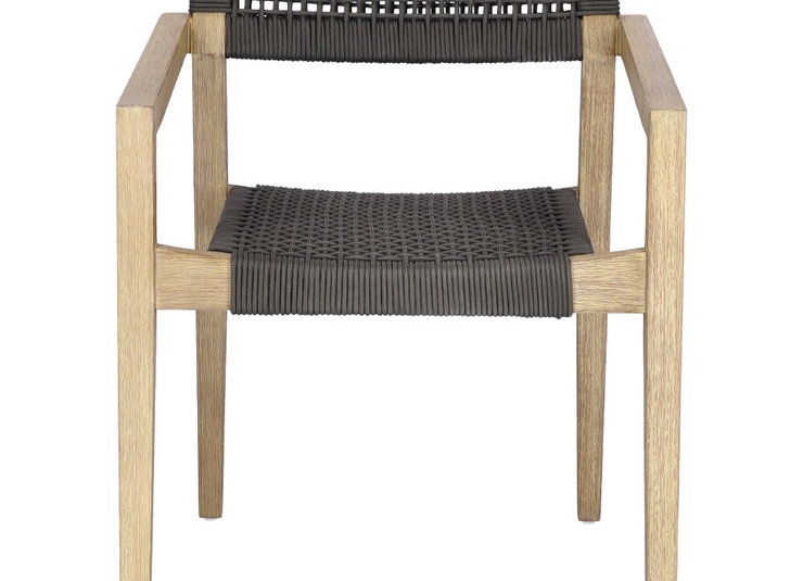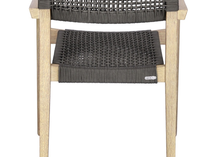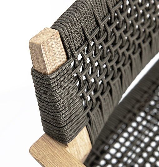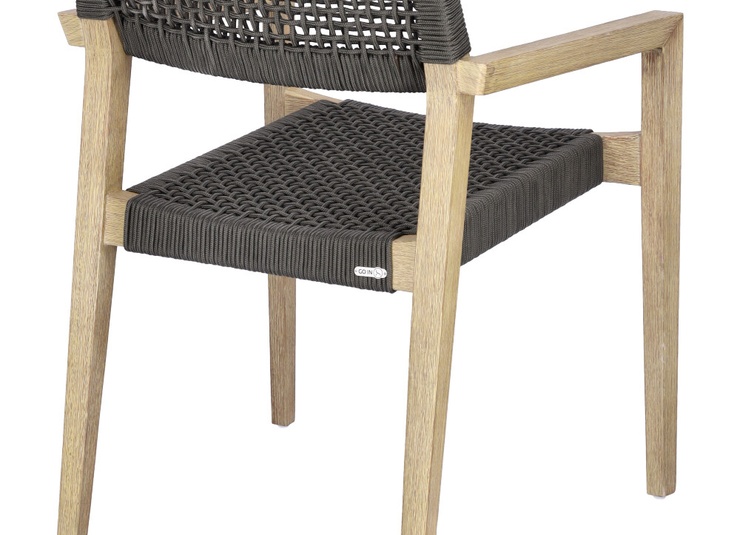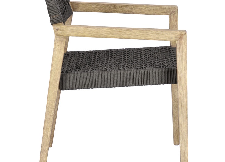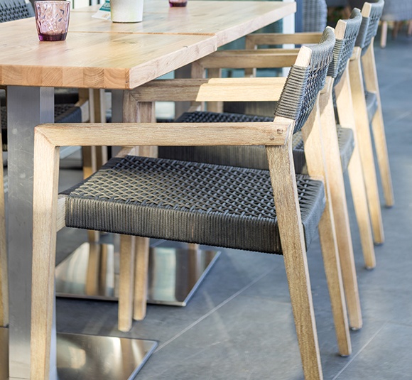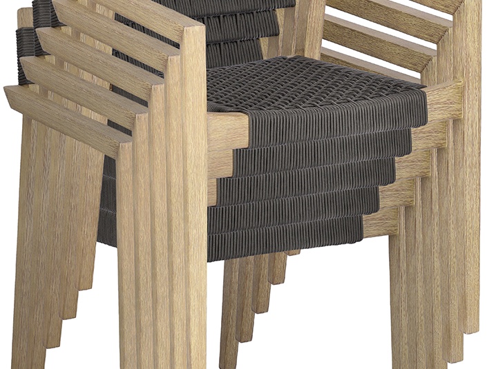 The stackable Vadim armchair has a modern, linear look; mainly due to the low backrest. The frame is made of structured, white brushed and varnished eucalyptus wood. The seat and back are made of open polypropylene strings. For protected outdoor areas and indoor areas.