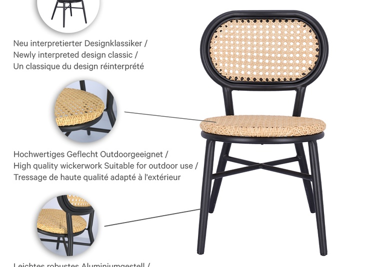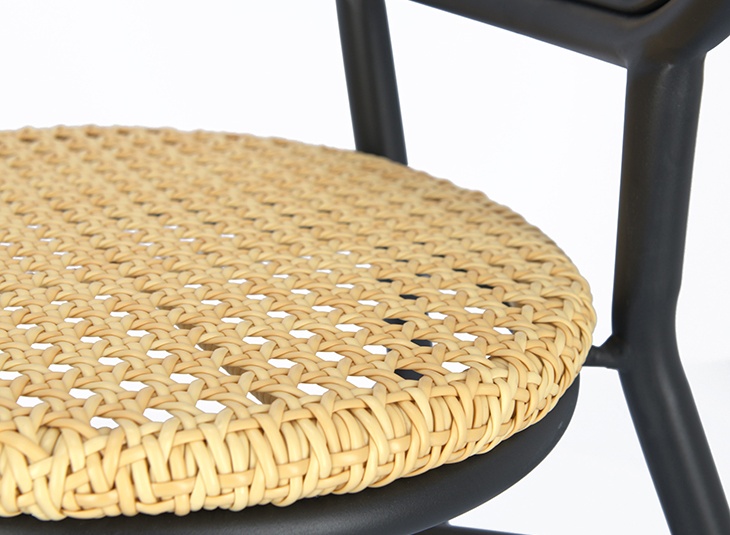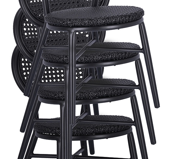 An eye-catcher on every terrace is the Madalina chair – optionally available with or without armrests. The high-quality polyethylene weave – available in two colour variations – in the Viennese weave design makes the chair look elegant and unique. The round design of the seat and armrests is inviting and harmonious at the same time. The model is stackable and is characterised by its black powder-coated aluminium frame with low weight.Product Code