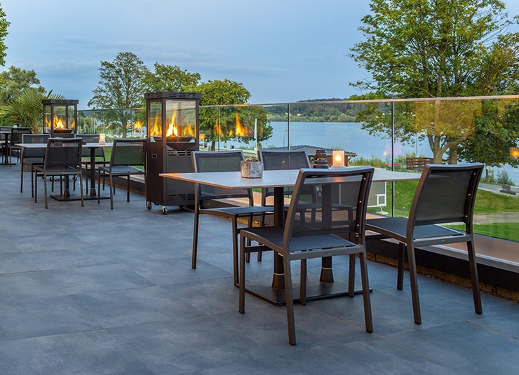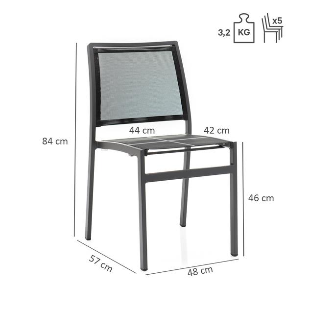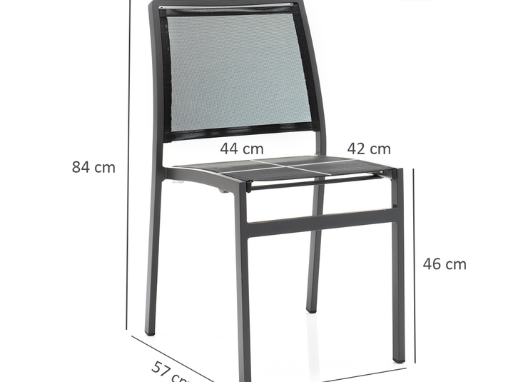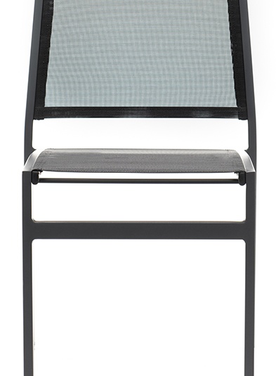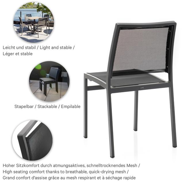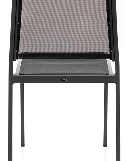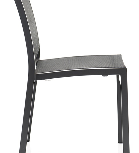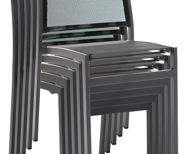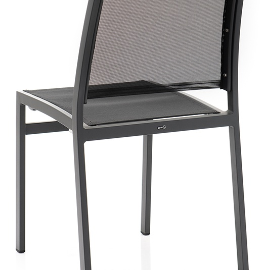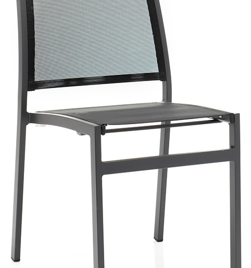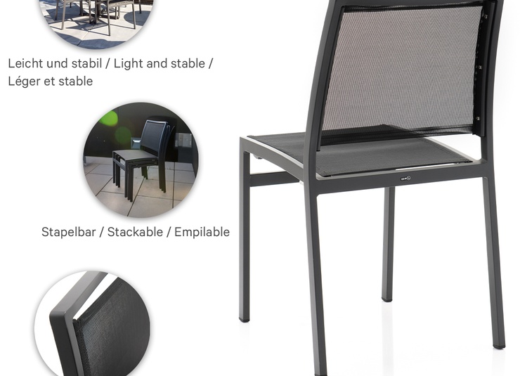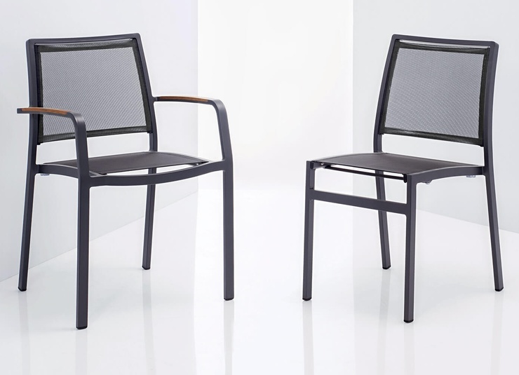Lightweight, modern and transparent – meet the stackable Tiras chair, available with or without armrests and an anthracite-coloured aluminium frame. The seat and backrest are covered in black, translucent fabric. The armrests made of untreated teak wood add a warm touch regardless of temperature outside.Product Code