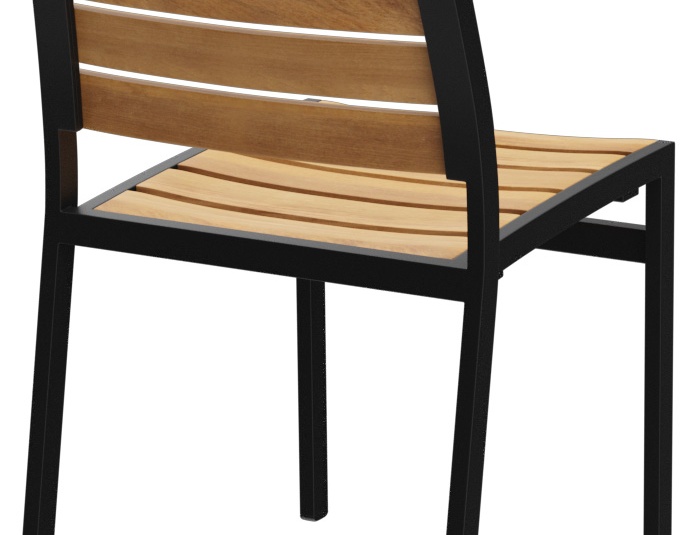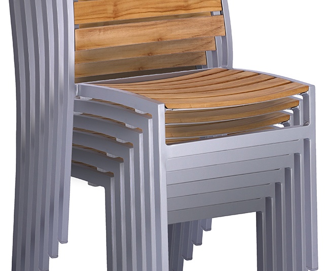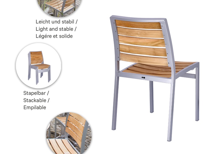 For nature lovers, the stackable Verio chair is the right choice. The aluminum frame is powder-coated in silver or black, easy to care for and weather-resistant, and contrasts elegantly with the seat and back made of untreated teak slats. The solid wood slats in the seat and back are ergonomically shaped and provide comfortable seating. Teak is resilient, can remain outdoors year-round, and when left untreated develops an elegant silver-gray patina. Anyone wishing to preserve the yellow-brown color tone should oil the surfaces before first use and refresh the treatment regularly. Ideal for flexible outdoor areas: Verio is stackable.- Lightweight and stable