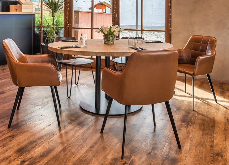 With its striking column shape, the Kapoda model – available as a dining or standing table – catches the eye. The frame can be combined with different tabletops and formats. The base and column are made of black powder-coated steel.Product Code