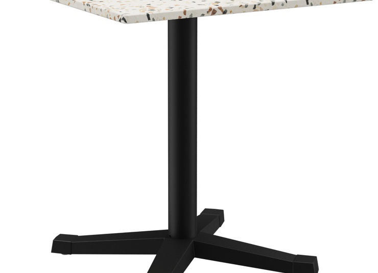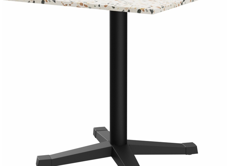The table model Kata – suitable for both indoor and outdoor use – features a black powder-coated steel frame with a classic straight toe foot, which can be combined with various tabletops. It is available in dining table height, with FLAT technology or adjustable floor gliders, and can additionally be equipped with a tilting mechanism for space-saving storage. The hydraulically mounted floor gliders of the FLAT system automatically adapt perfectly to uneven floors, meaning you can say goodbye to wobbly tables for good! The patented system immediately responds to the surface when the table is placed, ensuring a stable stand.- Highly weather-resistant and easy to maintain due to powder coating