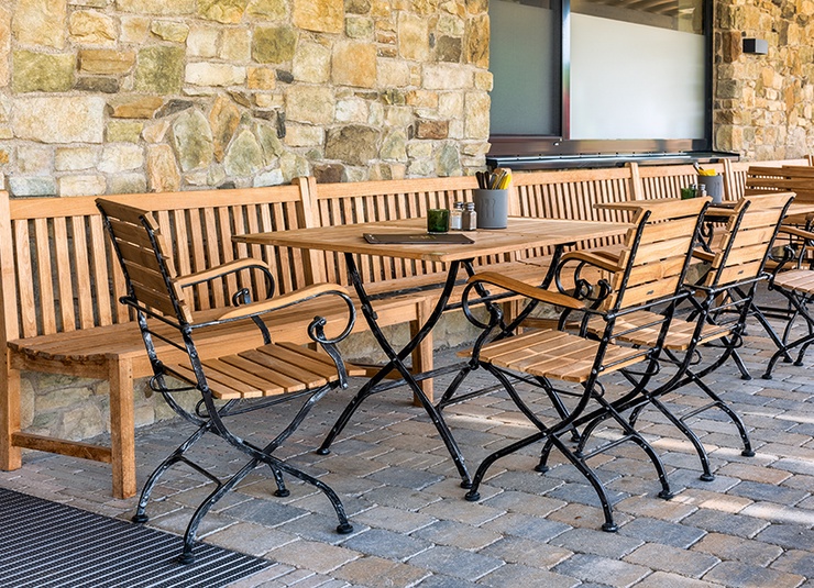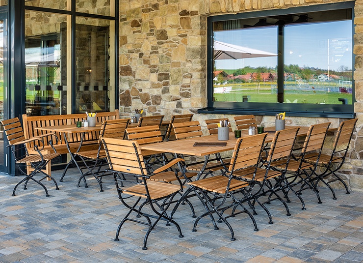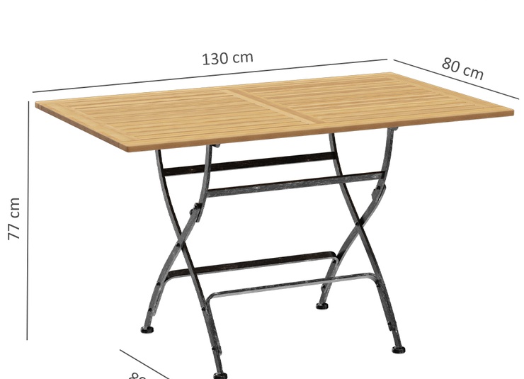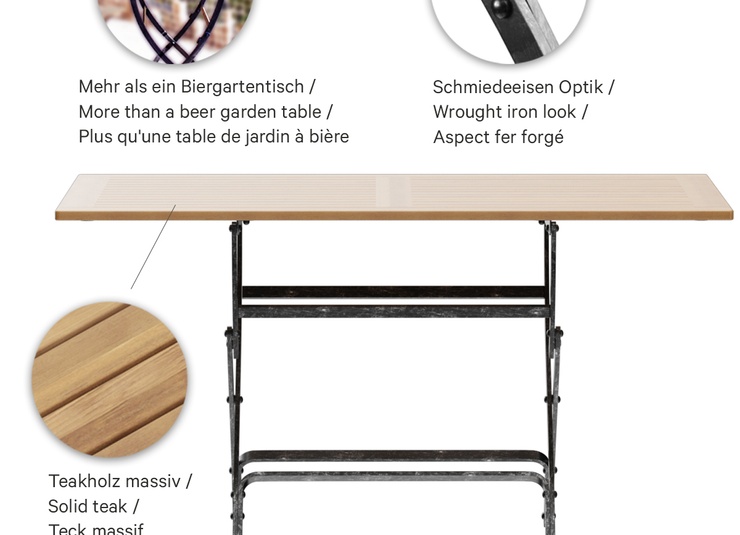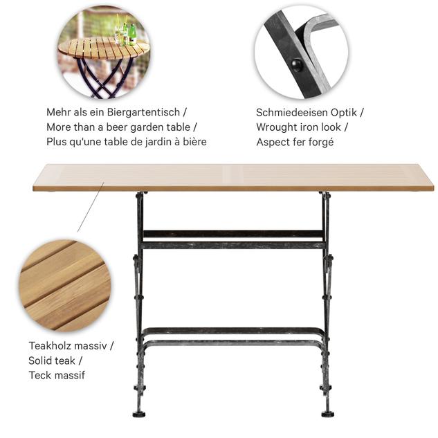 The Valentin T table is a classic beer garden table made of elegant teak wood and sturdy steel. The black coating with silver color accents provides an unparalleled wrought iron effect and makes the frame a real eye-catcher. It is available in various sizes and shapes. Particularly practical: the table can be folded, stored space-saving, and is easy to maintain.- Elegant teak wood and sturdy steel frame with wrought iron look
