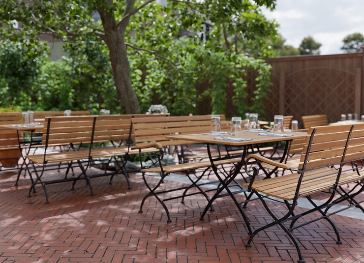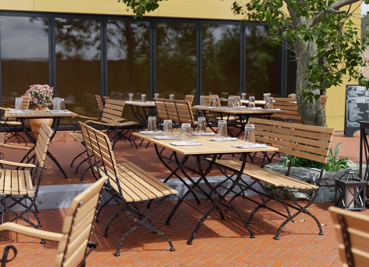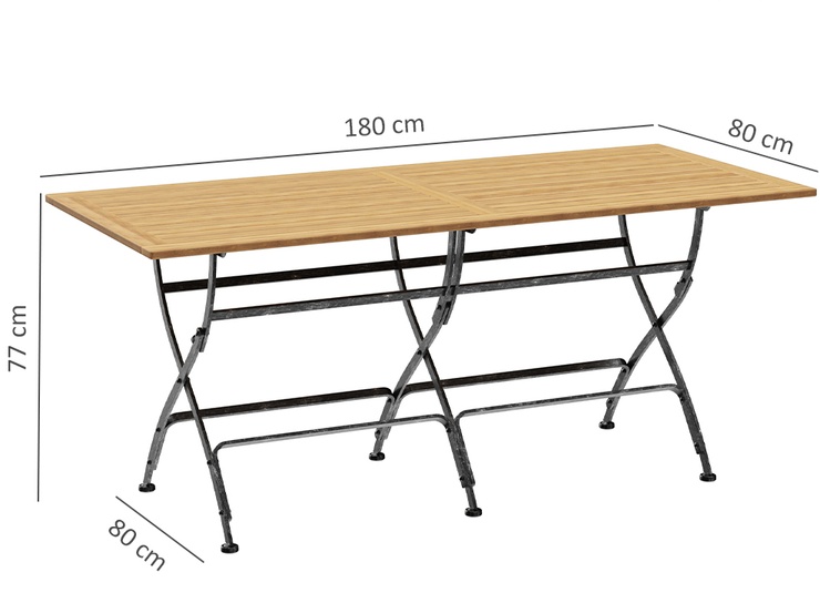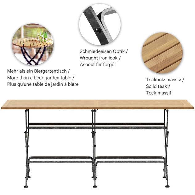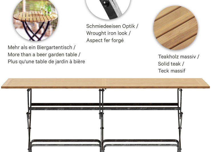 The Valentin T table is a classic beer garden table made of elegant teak wood and sturdy steel. The black coating with silver color accents provides an unparalleled wrought iron effect and makes the frame a real eye-catcher. It is available in various sizes and shapes. Particularly practical: the table can be folded, stored space-saving, and is easy to maintain.- Elegant teak wood and sturdy steel frame with wrought iron look
