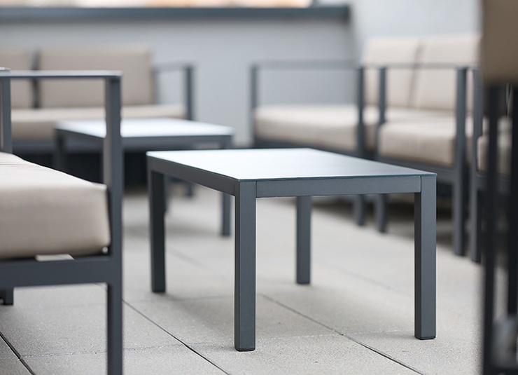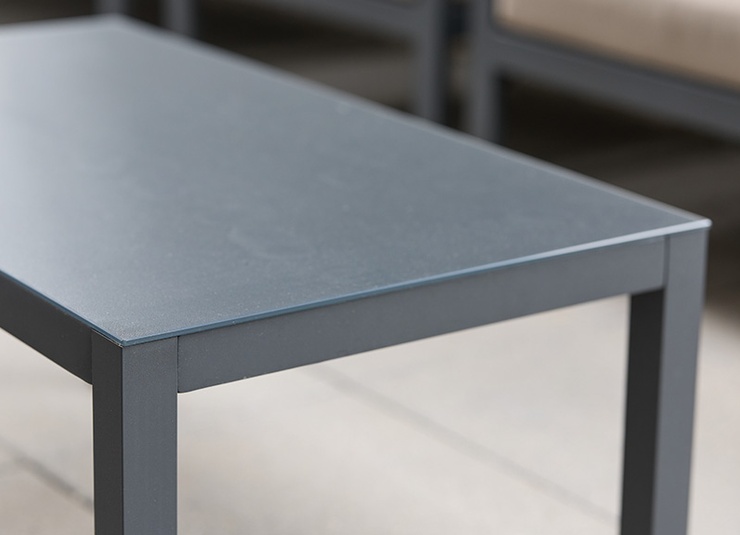The Sorelia lounge set consists of an armchair, two-seater sofa and coffee table with glass top. The frame is made of powder-coated aluminum in anthracite; the seat and back cushions are fitted with a removable and washable SUNBRELLA or AGORA cover. They should be protected from moisture and stored in a dry place when not in use. Store the cushions indoors and ensure that they are completely dry before storing and covering them.Product Code