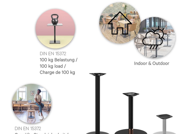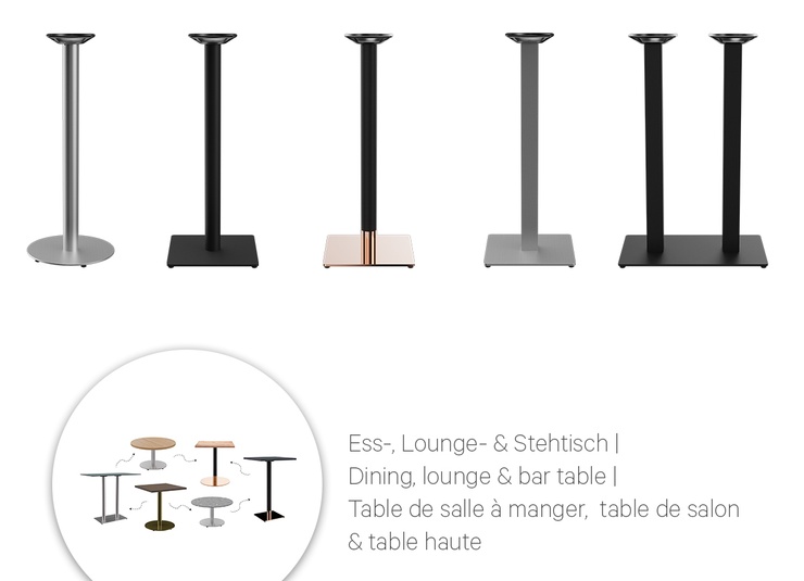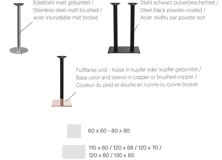 Round, angular – high, low – large, small: Kerst is characterised by its great variety. The powder-coated aluminium frame is available in black or stainless steel effect and can be combined with various tabletops. It features manually adjustable gliders. You can create interesting contrasts by combining angular legs with round columns. For indoor and outdoor use.Product Code