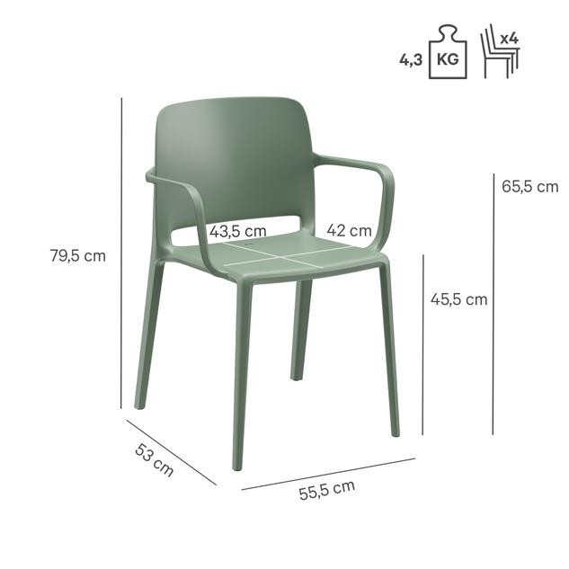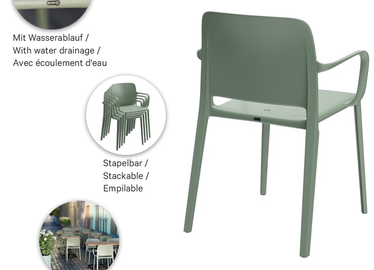 The robust outdoor chair Edor made of glass fiber–reinforced polypropylene is UV-resistant, weatherproof, and designed for professional use in contract environments. Thanks to the integrated drainage system, no water collects on the seat surface – ideal for outdoor areas used year-round. The chair supports loads of up to 160 kg, providing sufficient safety and stability even with high traffic. Space-saving stackable, it is perfectly suited for restaurants, hotels, canteens, and event areas. Available as a classic chair or as an armchair, the range offers maximum flexibility in seating arrangements. The excellent price-performance ratio makes it an economically sound alternative to metal or wooden furniture.- Weatherproof & UV-resistant for long-term professional outdoor use.