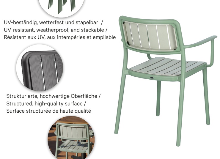 - UV-resistant, weatherproof and stackable for professional catering use.