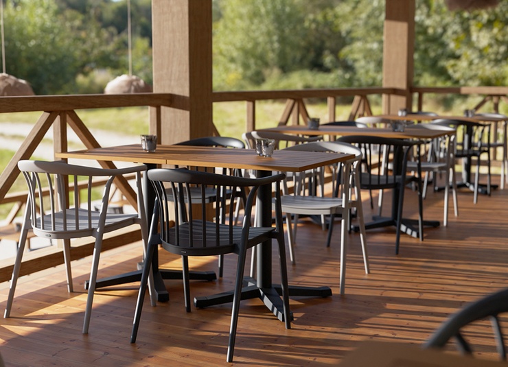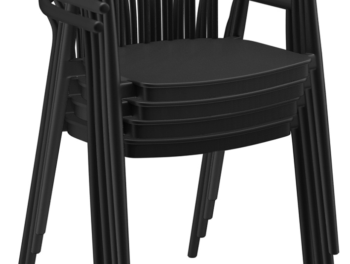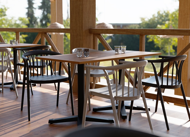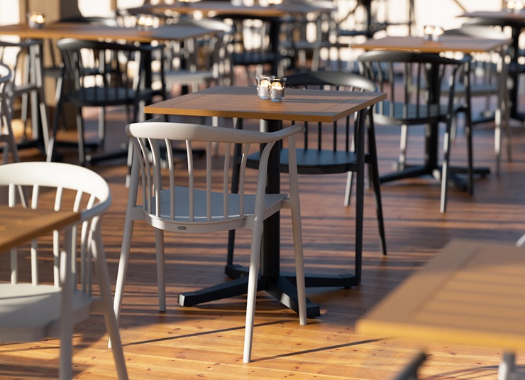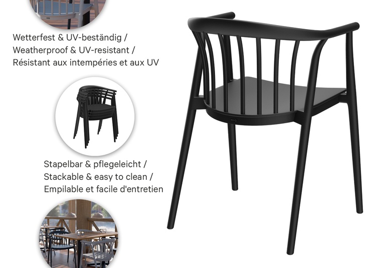 Classic ladder-back chair made of sturdy, glass-fiber-reinforced plastic – Esina is a design classic, newly interpreted for professional use. The ergonomically shaped backrest and the wide seat provide a comfortable seating experience even during extended use. The chair is stackable, UV-resistant, weatherproof and therefore suitable for both indoor and outdoor areas. Thanks to its robust, easy-to-maintain surface, it is ideal for gastronomy, hospitality, canteens, and high-traffic contract areas. Available as an armchair and matching barstool for a cohesive interior concept.- Design classic in modern, robust plastic.