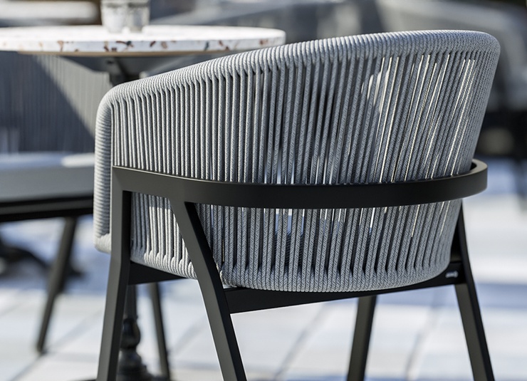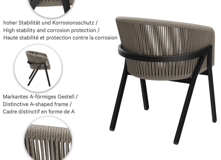 The outdoor chair Maviel is designed for permanent use in outdoor areas and combines a clean look with high everyday practicality. Its distinctive feature is the A-shaped frame: a striking, architectural line design that gives the chair an independent silhouette and visual lightness. The powder-coated aluminum ensures stability, low weight, and long-lasting corrosion protection. The backrest made of weather-resistant synthetic rope picks up the modern form, offers pleasant flexibility, and does not absorb water when it rains. As a result, the chair dries quickly and is ready for immediate use again without extensive maintenance. The design is complemented by a matching Olefin seat cushion that is colorfast, UV-resistant, and easy to care for.