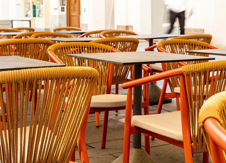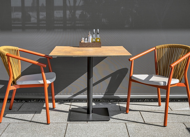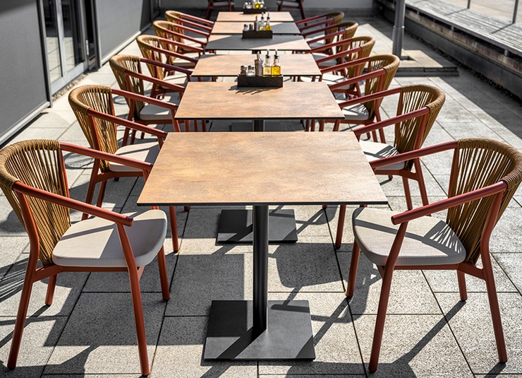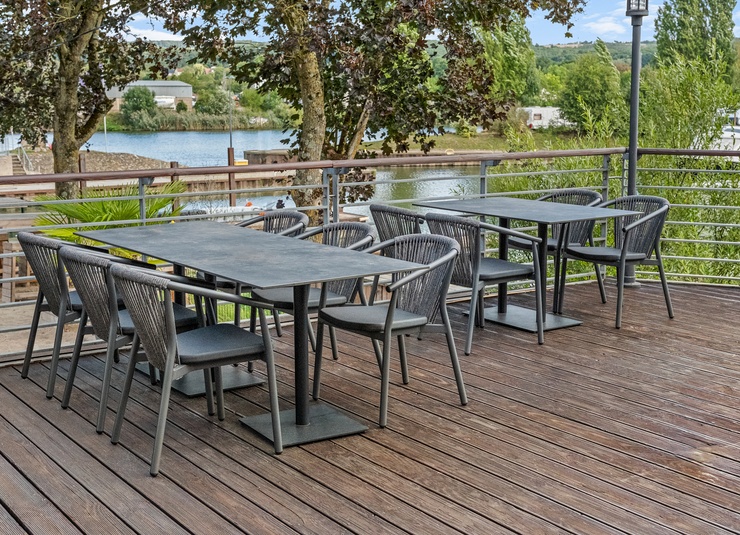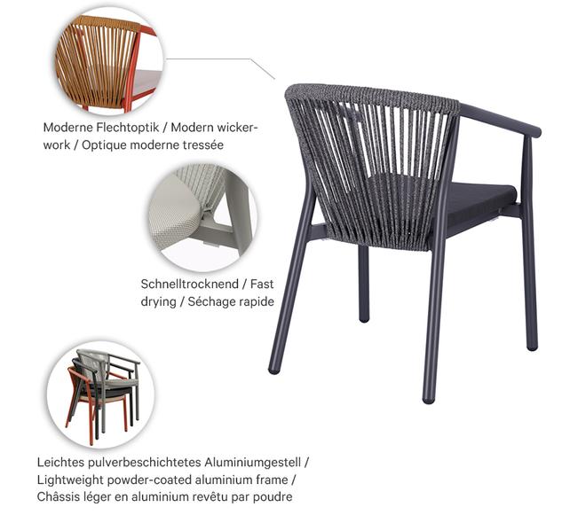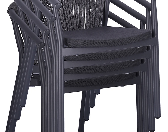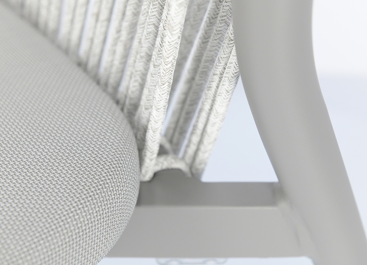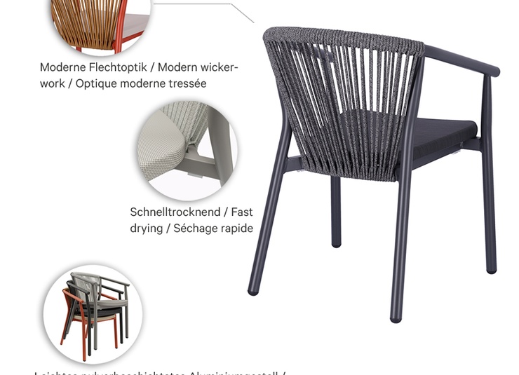 The Zaki outdoor series includes an armchair, a lounge chair and a 2-seater lounge with a powder-coated aluminium frame. All models are stackable, easy to handle and therefore ideal for venues with frequent rearrangements and limited storage space. Seats made of Textilene and backrests made of rope weave are quick-drying and do not absorb water – perfect for continuous outdoor use. The materials are low-maintenance, UV-resistant and weatherproof, keeping maintenance requirements to a minimum. This makes the series particularly suitable for gastronomy, hospitality and demanding contract areas with high frequency.- Stackable, lightweight aluminium frame for flexible handling and space-saving storage.