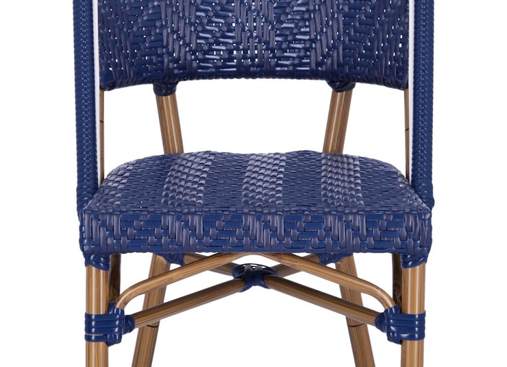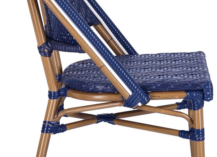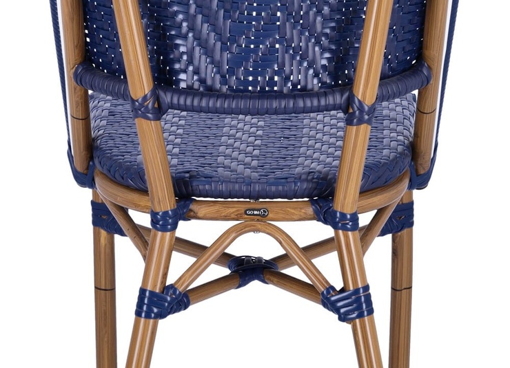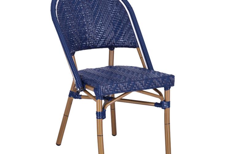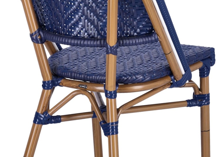 The Melara stackable chair brings a fresh sea breeze into street cafés, bistros and onto the terrace. The powder-coated aluminium frame with a rattan look is covered with a polyethylene mesh and is available either plain or with a blue and white lozenge structure.Product Code