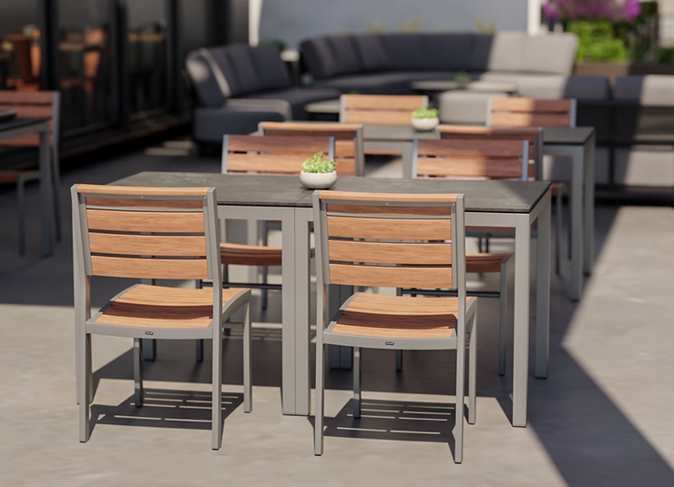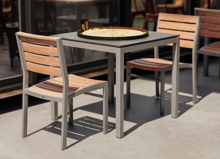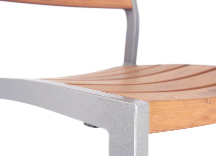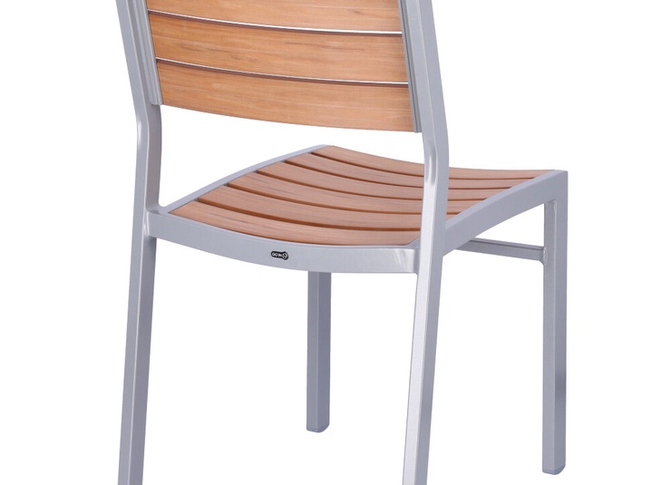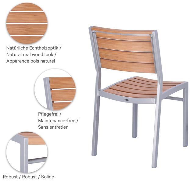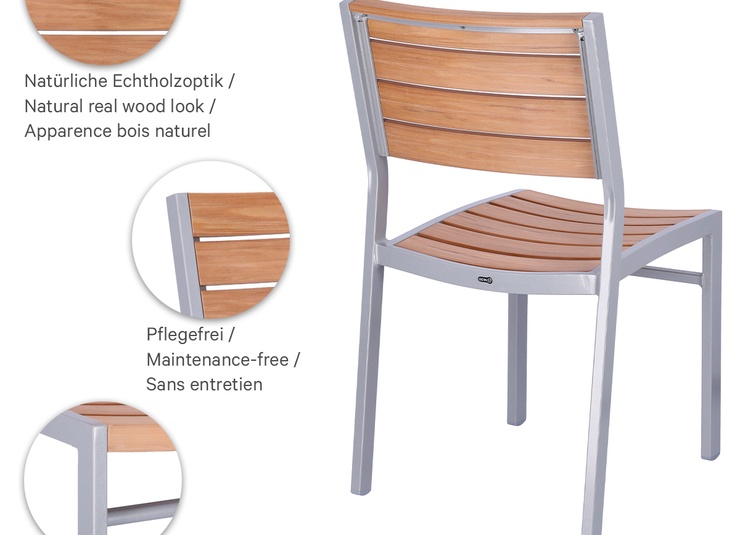 The stackable chair TITO combines modern design with a warm, natural appearance. The frame made of powder-coated aluminum and the slats in a wood look make it particularly easy to care for, durable, and ideal for indoor and outdoor use. In the limited color variant Natural Amber, TITO features a slightly reddish, amber-toned nuance that gives it a particularly cozy and expressive character. This distinctive coloring in particular makes the chair stand out and clearly distinguishes it from the table and armchair in the series.- Real wood look in amber color