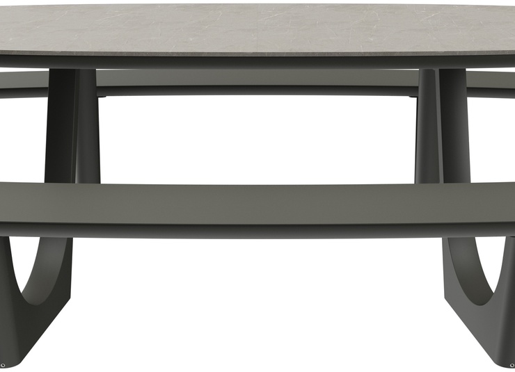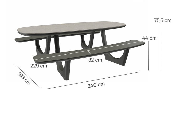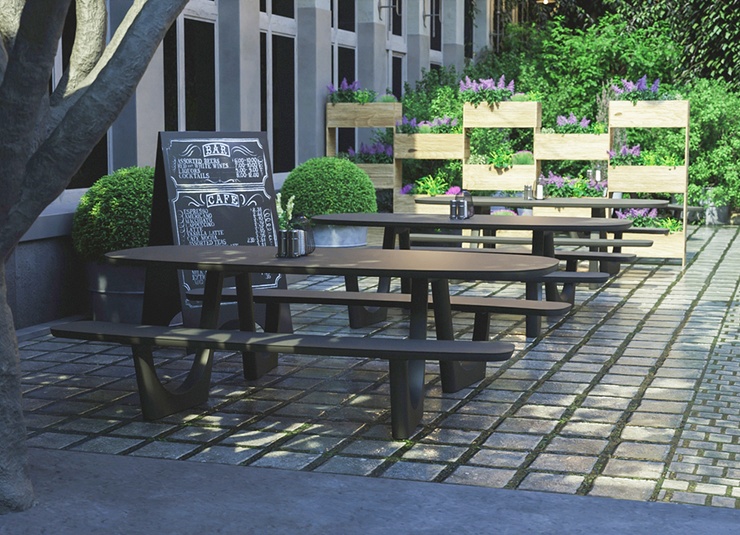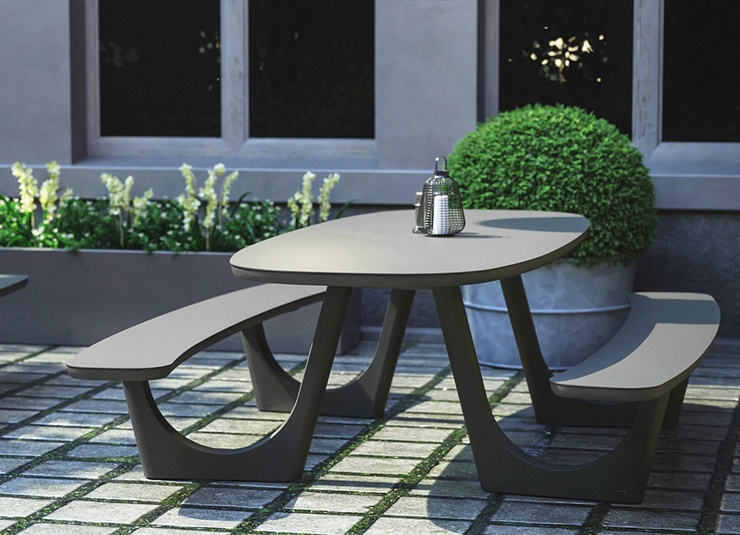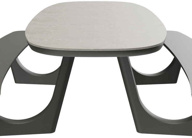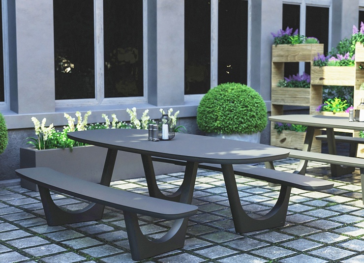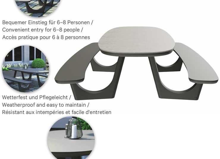 Boatnic is a fixed table-and-bench solution in a modern boat shape and offers seating for 6–8 people – ideal for gastronomy, contract and public spaces. Two separate seating surfaces made of powder-coated aluminium allow comfortable seating without having to lift legs or climb and encourage spontaneous encounters and interaction. Weather-resistant, low-maintenance materials make Boatnic perfect for heavily frequented outdoor areas. Available options include a fully powder-coated aluminium version or a variant with an aluminium substructure and ceramic surfaces. The ceramic surfaces are heat-resistant, scratch-resistant, stain-resistant, UV-resistant, hygienic and easy to clean. Delivery is flat-packed.- Comfortable access without climbing for 6–8 people