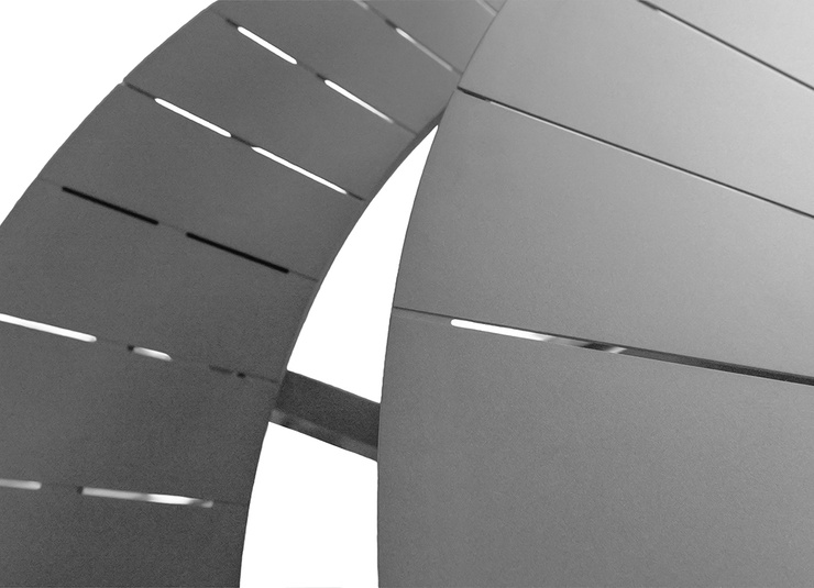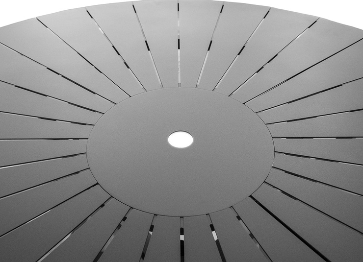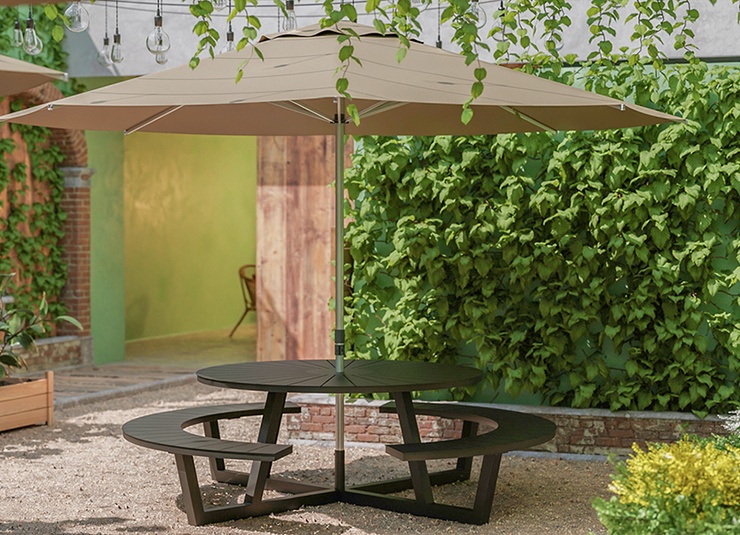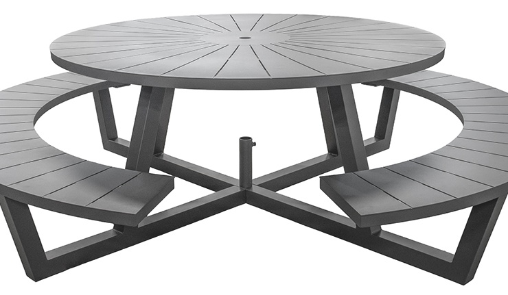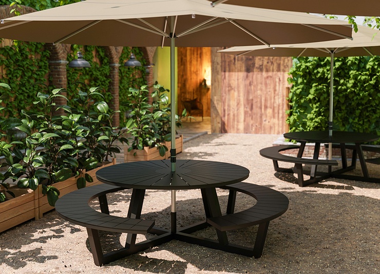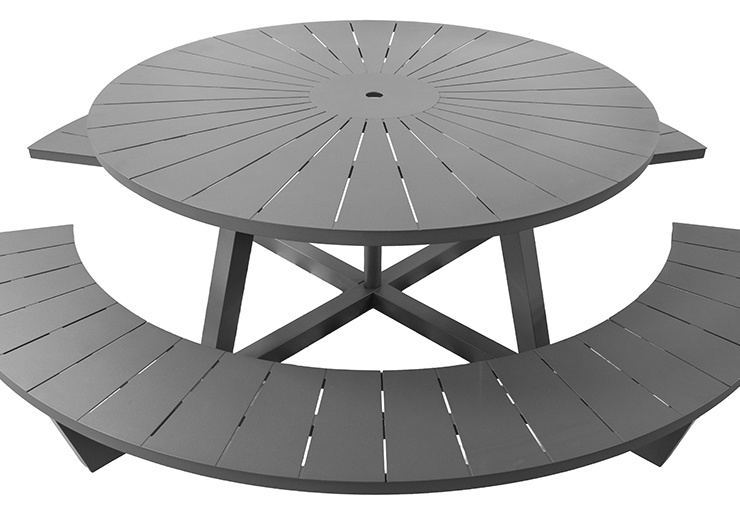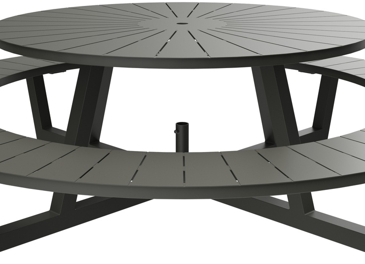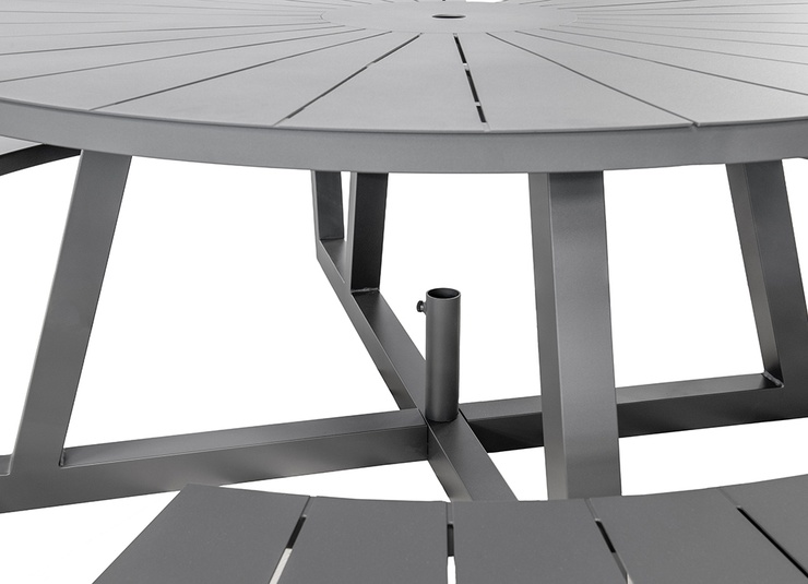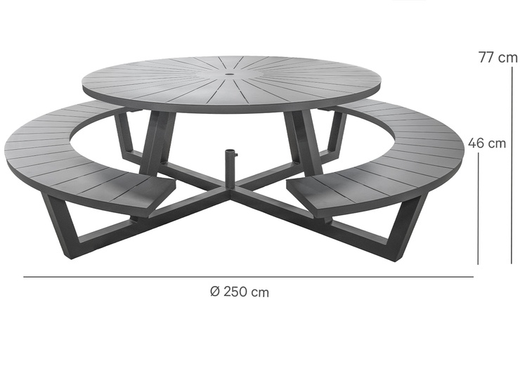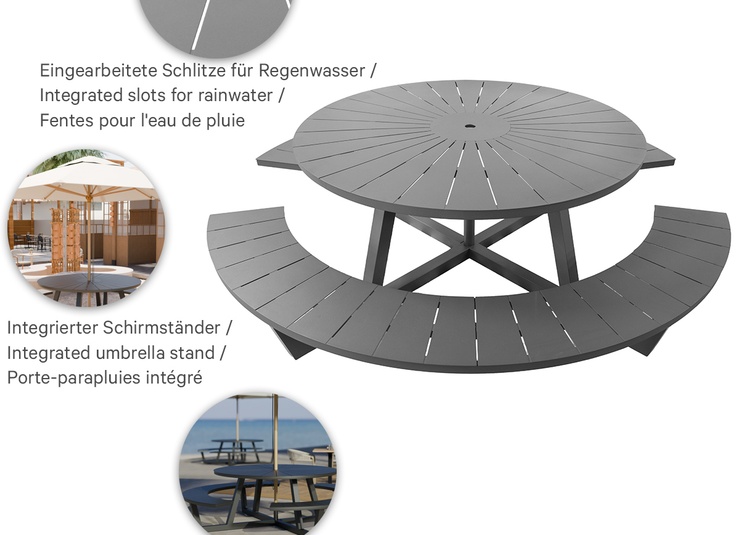 The round table-bench combination Roundic is a robust meeting point for gastronomy, contract and public areas. Two separate half-round seats made of powder-coated aluminium offer space for 8-10 people and allow comfortable sitting down without lifting legs or climbing over benches. Slots integrated into the table top and seats allow rainwater to drain away so everything can be used again quickly. Weatherproof, low-maintenance materials and the umbrella hole in the centre make the seating group ideal for high-traffic outdoor areas. The combination is delivered disassembled and is easy to assemble.- Separate seat halves – comfortable seating without climbing.